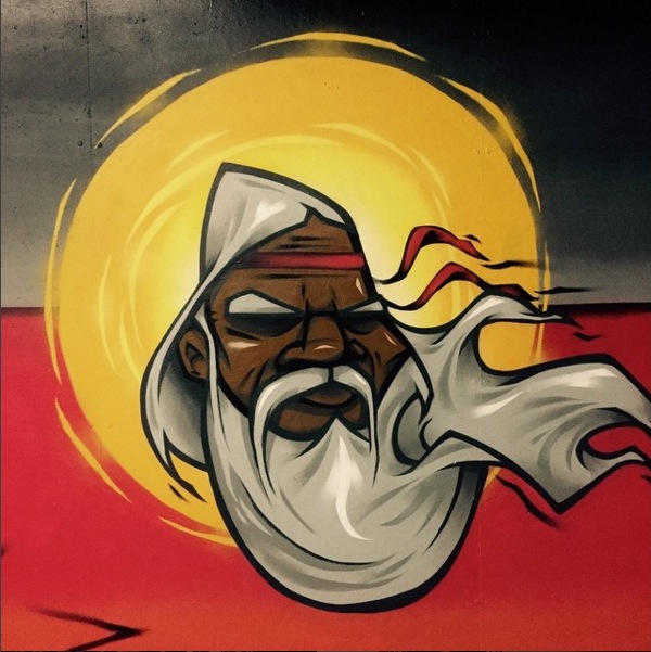 I aged the piece by sanding it back, painting it with PVA mixed with tea and flaking parts off the wall. Then I capped the piece, postered over it, and rocked a few stencils.
